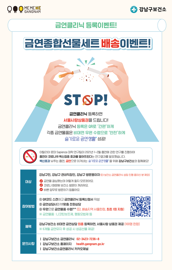 자세한 내용은 강남구보건소 금연클리닉으로 문의하면 된다.