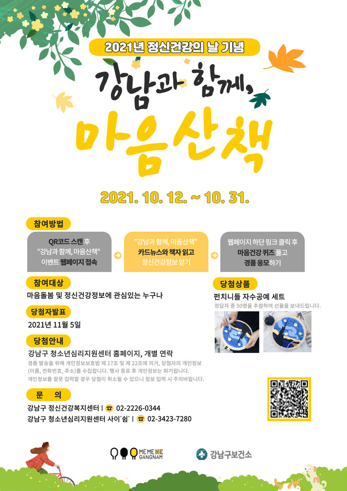 [시민일보 = 이대우 기자] 서울 강남구(구청장 정순균)는 최근 ‘세계 정신건강의 날’을 맞아 12~31일 ‘강남과 함께, 마음산책’ 행사를 개최한다.