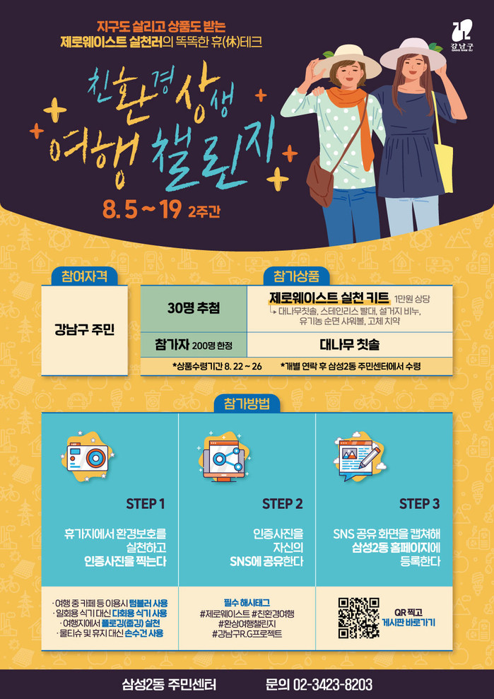 ▲카페 이용 시 텀블러 사용 ▲일회용품 대신 다회용품 사용 ▲쓰레기 수거 등 여행지에서 실천한 환경보호 실천 인증 사진을 SNS에 공유하고 삼성2동 주민센터 홈페이지 게시판에 인증하면 응모가 완료된다.
