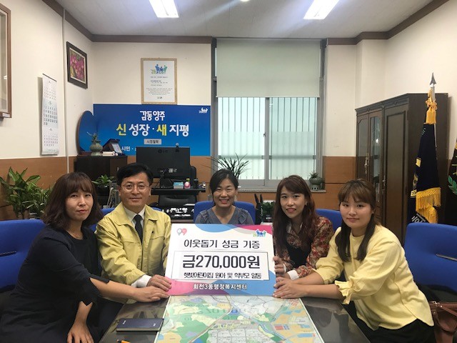 경기 양주시 고암동에 위치한 햇빛어린이집은 최근 회천3동 행정복지센터를 방문해 저소득층 어려운 이웃을 위해 써달라며 이웃돕기 성금 27만원을 기탁했다. 성금은 ''아나바다 알뜰 나눔장터 물품 판매 수익금으로 마련됐다. 사진은 기념촬영을 하는 모습.