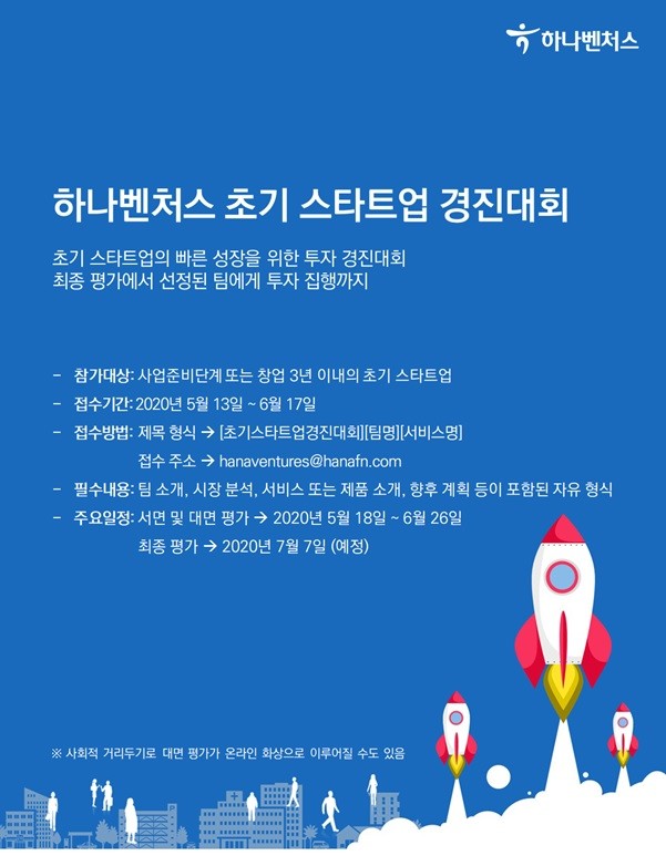 하나벤처스 관계자는 “이번 경진대회를 통해서 초기 스타트업들이 더욱 빠르게 성장할 수 있는 발판이 되기를 바란다”며, “선발된 회사들에 투자 집행뿐만 아니라 지속적인 멘토링을 통해서 든든한 파트너가 될 것”이라고 덧붙였다.