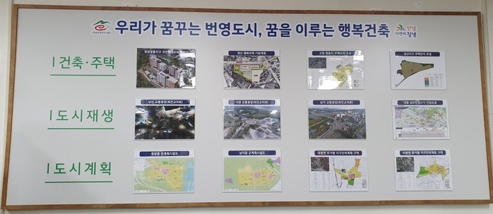 현황판은 인구증가 시책에 도움이 되는 창녕말흘지구 국민임대주택과 영산 행복주택, 고암면·성산면 전원주택 단지조성 사업안내를 시작으로, 그동안 추진한 남산·낙영·남지 교통광장 공사 추진실적이 중앙에 배치됐다.