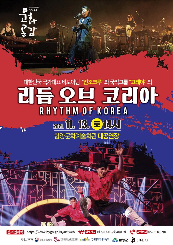 함양군문화예술회관은 비보이팀‘진조크루’와 국악 월드뮤직그룹‘고래야’의 협연공연‘리듬 오브 코리아’를 오는 11. 13.(토) 오후 2시 문화예술회관 대공연장에서 선보인다.