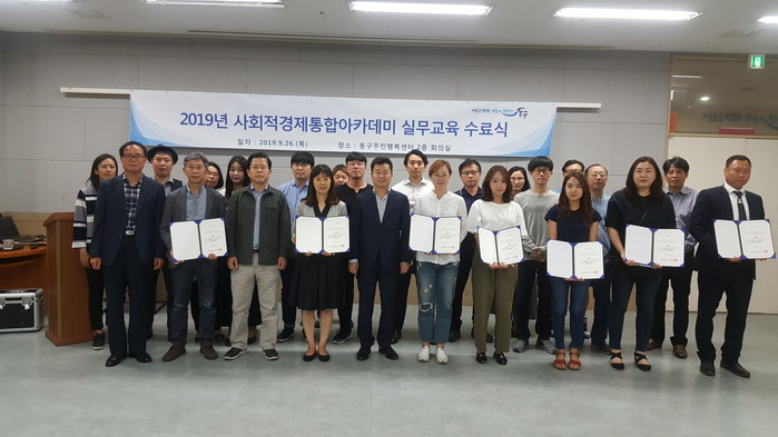 인천 동구는 최근 주민행복센터에서 ‘2019년 사회적경제통합아카데미 실무교육’ 수료식을 개최했다. 사회적통합아카데미는 사회적경제 활성화 기반을 마련하고, 교육의 효율성을 증진시키기 위해 진행됐다. 사진은 수료생들이 기념촬영을 하는 모습.(사진제공=동구청)