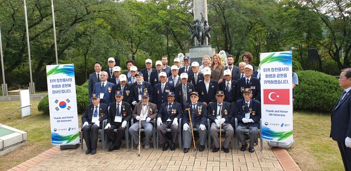경기 용인시 기흥구 동백동 '터키군 참전기념비'에 최근 터키 한국전 참전용사들이 방문해 전쟁으로 목숨을 잃은 용사들을 위해 참배했다. 이날 터키 한국전 참전용사와 가족 및 국가보훈처 관계자 등 150여명이 참석했다. 사진은 기념촬영을 하는 모습.(사진제공=용인시청)