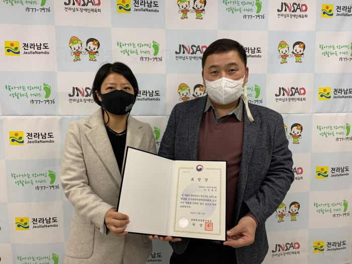 | ▲ 김은래(우측) 사무처장이 정광진(좌측)주임에게 문화부장관으로부터 수상의 영예를 전달하고 있다.(출처=전남장애인체육회) |