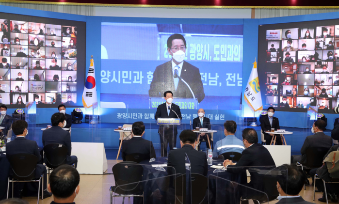 코로나19로 최소한의 인원만 행사장에 참석하고, 주민 180명이 비대면 영상을 통해 참여한 이날 광양시 도민과의 대화는 김기홍 전남도 정책기획관의 도정보고, 김경호 광양시 부시장의 광양시 현안보고, 김 지사와 현장·영상 참여자 간 대화 순으로 진행됐다.