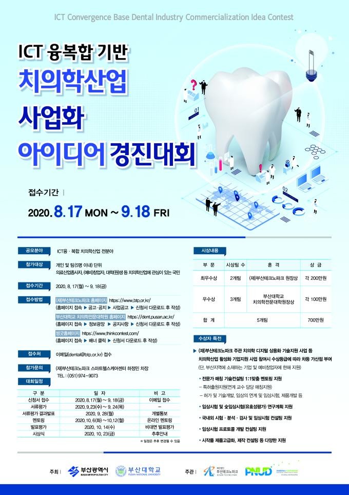 부산시(시장 권한대행 변성완)는 10월 14일 부산테크노파크에서 열리는 「2020년 ICT 융복합 기반 치의학 산업 아이디어 경진대회」에 참가할 개인 및 팀(5명 이내) 단위 참가팀(10개)을 9월 18일까지 모집한다고 밝혔다.