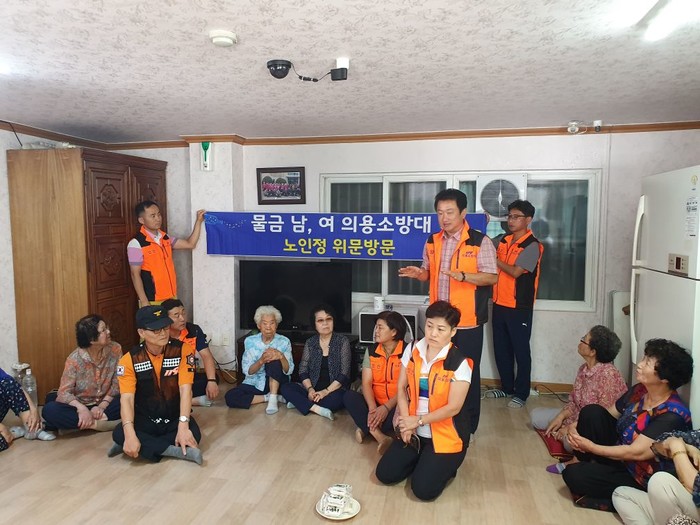 이날 방문에서 물금119안전센터 직원들은 어르신들의 건강체크와 건물 내 소화기 확인 등 소방안전점검을 실시하였으며, 물금의용소방대에서는 쌀, 휴지, 다과류 등 위문품을 전달하였다.
