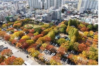 부산시청 야외 녹음광장이 오색빛깔 단풍으로 탈바꿈되어 시민들이 가을 정취를 만끽할 수 있는 장소로 이용되고 있다.