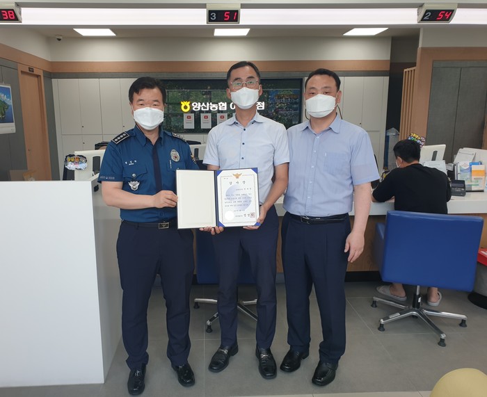 [양산=최성일 기자]양산경찰서는(서장 정성학) 지난 31.(월) 양산농협 어곡지점 방문, 보이스피싱(전화금융사기) 예방한 농협직원에 대하여 감사장을 수여하였다. 이 자리에는 지점장(김종운)과 유공 직원 정부영 등이 참석하였다.