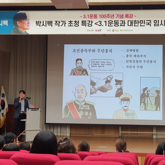 특히 3.1운동 100주년을 기념해 300만부 이상의 판매고를 올린 조선왕조실록의 작자 박시백의 ‘3.1운동과 대한민국 임시정부’ 강연은 애국심을 고무시키고 일제 강점기 숨겨진 비하인드 스토리를 들을 수 있는 뜻깊은 강연이 됐다.