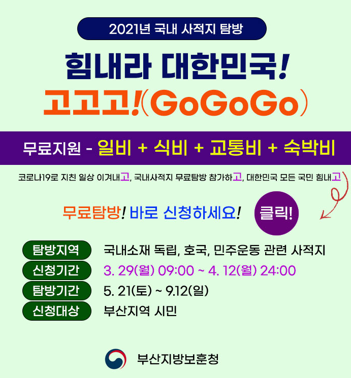 접수기간은 3.29.부터 4.12.까지이며, 구체적인 사업의 내용 및 접수방법은 부산지역 현충시설 통합자료지원 플랫폼<청바지> 또는 부산지방보훈청 블로그나 페이스북 을 통하여 확인가능하다.