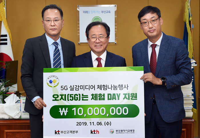 부산광역시교육청(교육감 김석준)은 지난 6일 오후 3시 시교육청 교육감실에서 KT(부산고객본부장 정정수) 및 KTH(대표이사 김철수)와 ‘5G 실감미디어 체험 프로그램 협약’을 체결했다.
