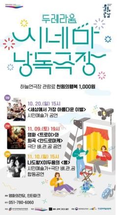 ‘두레라움 시네마낭독극장’은 영화의전당, 극단 배관공(배우, 관객 그리고 공간) 그리고 시민예술가 15명이 협업해 총 3개의 작품을 3부작으로 선보이는 프로그램이다. 지난 10월 20일 노희경 작가의 <세상에서 가장 아름다운 이별>이 1부 첫 무대에 올랐으며, 11월 9일에는 이번 프로젝트를 협업하고 있는 극단 배관공의 배우들이 직접 무대에 설 예정이다.