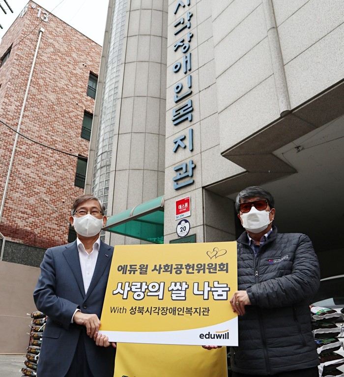 성북시각장애복지관 권오형 관장은 “코로나19로 후원이 줄어 어려운 때, 에듀윌에서 큰 도움을 주셨다. 기부해주신 쌀 덕에 많은 분들께서 행복한 가정의 달을 맞이하실 수 있을 것 같다”고 감사를 전했다.