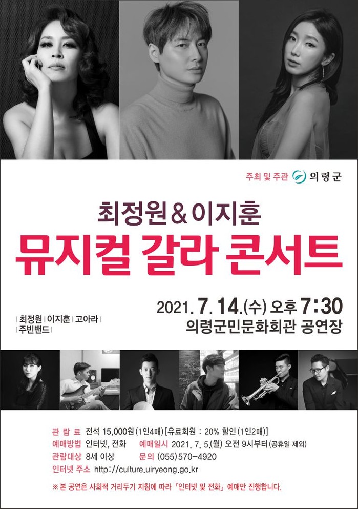 의령군(군수 오태완)은 7월 기획공연으로 『최정원&이지훈 뮤지컬 갈라콘서트』를 다가오는 7월 14일(수) 저녁 7시30분 의령군민문화회관 공연장 무대에 올린다.