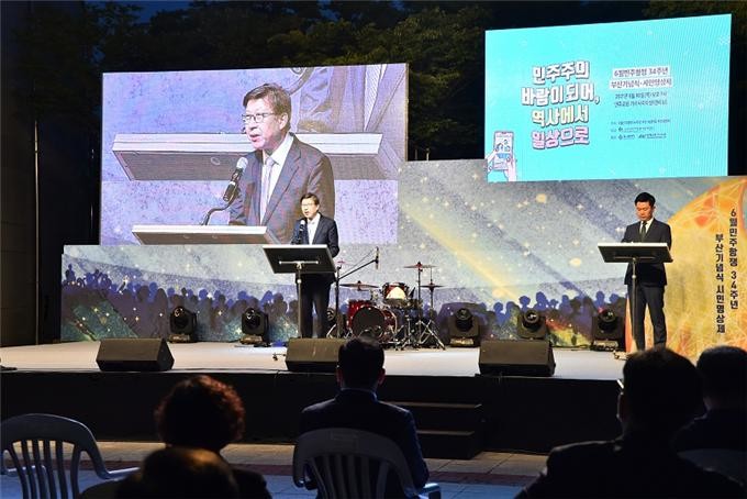 한편, (사)부산민주항쟁기념사업회 주관으로 열린 6월민주항쟁 부산기념식에서는 시민들이 직접 참여한 '시민영상제'의 수상작을 상영하고,민주주의 발전을 위해 산화한 황보영국 열사, 이태춘 열사, 박종철 열사, 김의기 열사 등의 유족이 직접 참석해 의미를 되새기는 뜻깊은 행사로 진행되었다.