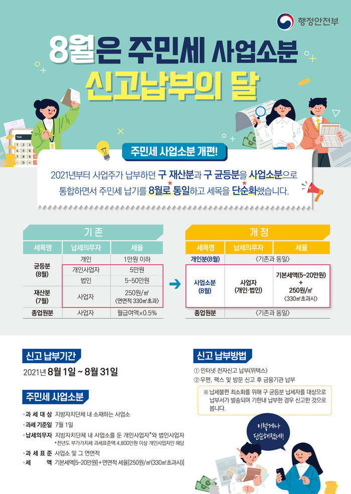 올해부터 주민세 과세체계가 개편되어 매년 7월에 신고·납부하던 종전 주민세 재산분과 8월에 부과되던 주민세 개인사업자·법인 균등분이 8월에 신고·납부하는 주민세 사업소분으로 통합되었다.