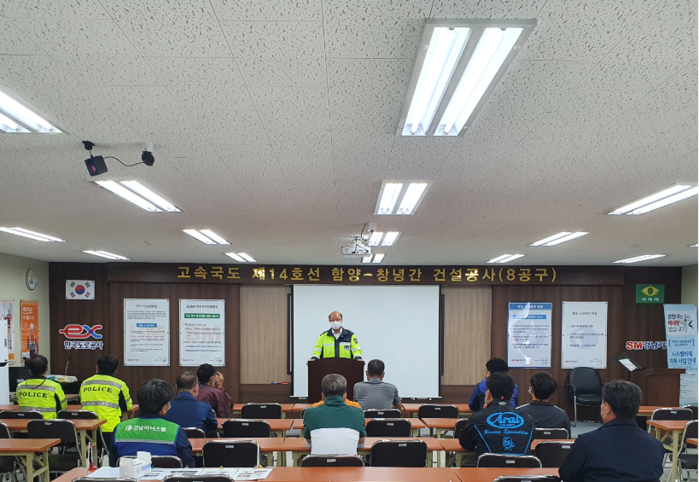 2020. 10. 20. 10:00 고속국도 제14호선 함양~창녕간 건설공사 현장 5개소 방문하여 공사관계자, 덤프트럭 운전자 등 상대로 최근 도내 난폭 . 보복 . 음주운전 등 교통안전 위협행위로 인한 교통사고 사례중심 및 죄질불량 . 상습 교통법규위반자 등에 대한 처벌 등 현장 안전교육을 실시하고 국민공감대 형성을 위한 안전운전 동참을 위한 협조를 당부했다.