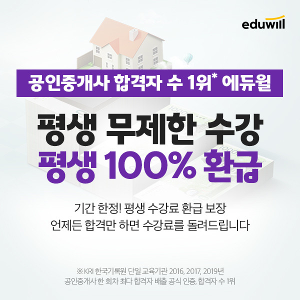 [시민일보 = 여영준 기자] 종합교육기업 에듀윌(대표 박명규)은 공인중개사 시험을 준비하는 수험생을 위해 ‘100% 환급 평생패스’를 마련하고 수강생을 모집한다.