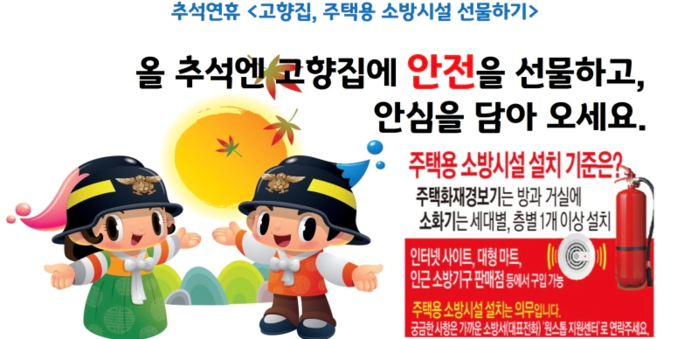 소방서 관계자는 “추석 연휴 고향 집 방문이 자제되는 만큼 가족에게 주택용 소방시설을 선물해 즐겁고 안전한 명절을 보내길 바란다”고 전했다.