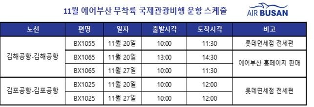 에어부산은 11월 한 달 동안 김해국제공항에서 3회, 김포국제공항에서 2회 무착륙 국제관광비행을 운항할 예정이다. 김해공항에서는 11월 20일 2편, 11월 27일 1편 운항하며, 김포공항에서는 11월 20일과 27일 각 1편씩 운항한다.
