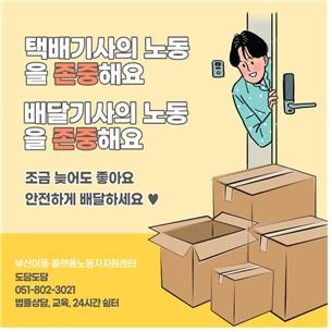 부산 이동·플랫폼 노동자 지원센터 ‘도담도담’(이하 센터. 센터장 현정길)은 추석 연휴를 맞아 오는 9월16일 오후 4시부터 5시까지 부산지하철 서면 역사를 중심으로 추석맞이 택배기사, 배달 노동자 존중 캠페인, ‘리스펙트-U’ 홍보 스티커를 시민들에게 나눠줄 예정이다.