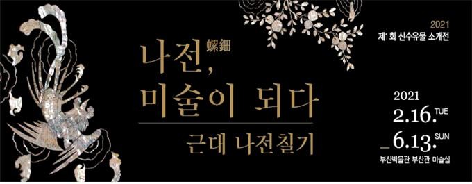 부산박물관은 근대 나전공예의 역사적 가치와 아름다움을 고려하여 2020년 총 31건 93점의 근대 나전칠기 관련 유물을 구입하였다. 이번 전시에는 근·현대를 대표하는 ▲나전칠기 공예가인 ‘김진갑(金鎭甲, 1900~1972)’의 <나전 칠 공작·모란무늬 병>을 비롯하여 ▲장수를 기원하는 ‘수壽’자와 봉황·복숭아나무 등 다양한 문양의 자개를 박아 화려함을 더한 <나전 칠 ‘수壽’자무늬 경상>, ▲동래 온천장에서 제작한 <나전 칠 대나무무늬 벼루함> 등 주요 유물 6점을 공개한다.