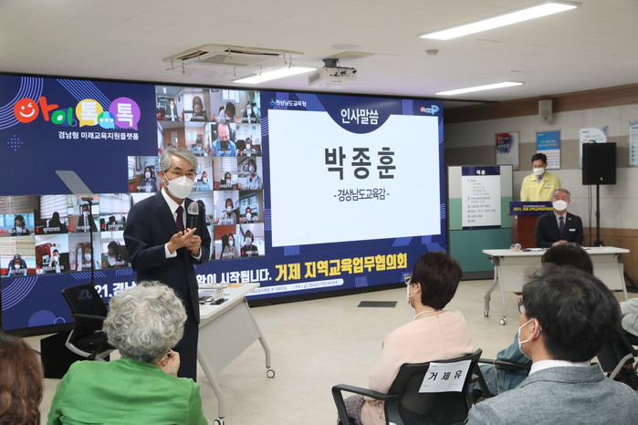 경상남도교육청(교육감 박종훈)은 지난 17일(월) 오후 거제교육지원청에서 ‘2021년 거제교육 업무협의회’를 개최하여 거제의 지역 현안과 미래교육에 대해 함께 고민하는 시간을 가졌다.