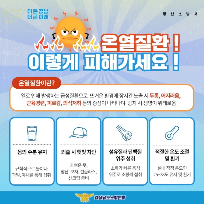 양산소방서(서장 박정미)는 계속되는 폭염으로 온열환자 증가가 예상됨에 따라 온열질환에 각별한 주의를 당부한다고 21일 밝혔다.