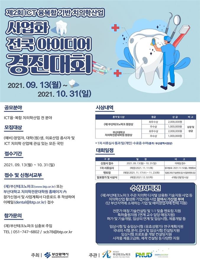 부산시(시장 박형준)는 오는 31일까지 ‘제2회 ICT 융복합 기반 치의학산업 아이디어 경진대회’에 참가할 개인 또는 팀(5명 이내)을 모집한다고 밝혔다.