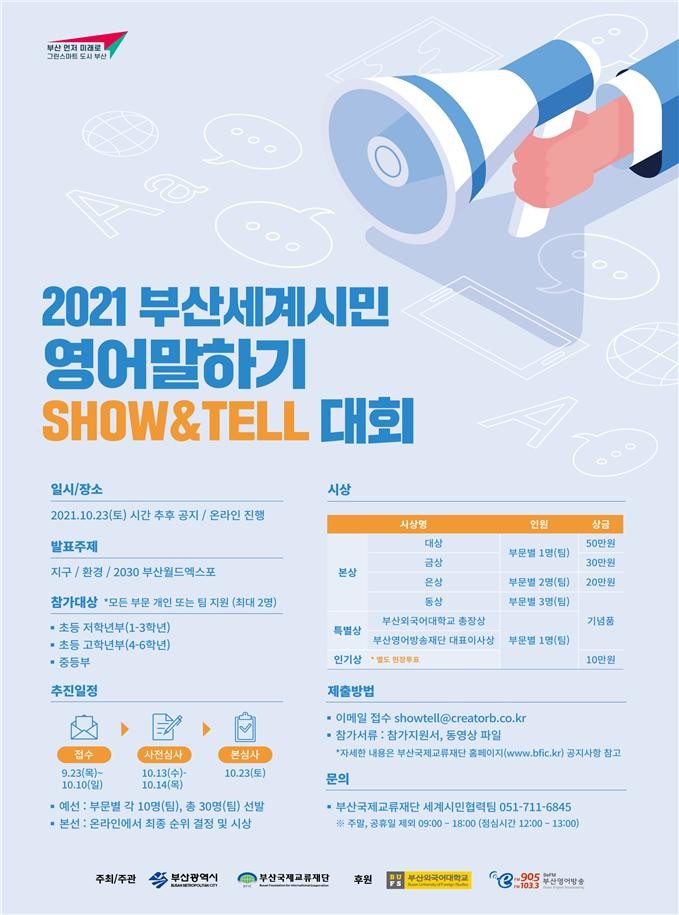 [부산=최성일 기자] 부산시와 부산국제교류재단은 오는 10월23일, 제16회 메타버스 부산세계시민축제 부대행사 ‘2021 부산세계시민 영어말하기(Show&Tell)대회’를 개최한다고 밝혔다.