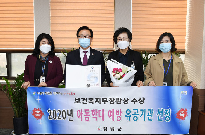 창녕군(군수 한정우)은 지난 19일 2020년 아동 전수조사 실시 공로로 아동학대 예방 유공기관 보건복지부장관상을 수상했다고 밝혔다.