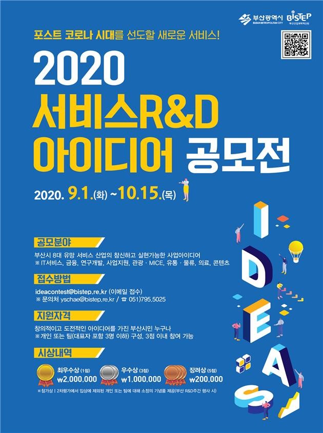 부산시(시장 권한대행 변성완)와 부산산업과학혁신원(원장 김병진)은 「2020년도 부산시 서비스 연구‧개발(R&D) 아이디어 공모전」을 시행하며, 다음 달 15일까지 아이디어를 접수한다고 밝혔다.