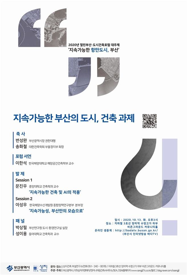 2007년부터 개최된 「열린부산·도시건축포럼」은 도시와 건축이 함께 나아가야 할 방향에 대한 자유로운 토론의 장으로 마련되어 왔다. 특히, 올해 행사는 코로나바이러스감염증-19(코로나19)로 인해 바다TV 온라인 생중계로 개최되는 만큼 이번 포럼의 주제와 도시건축에 대해 궁금한 사항이 있는 시민들은 실시간 댓글로 참여하여 질문할 수 있다.