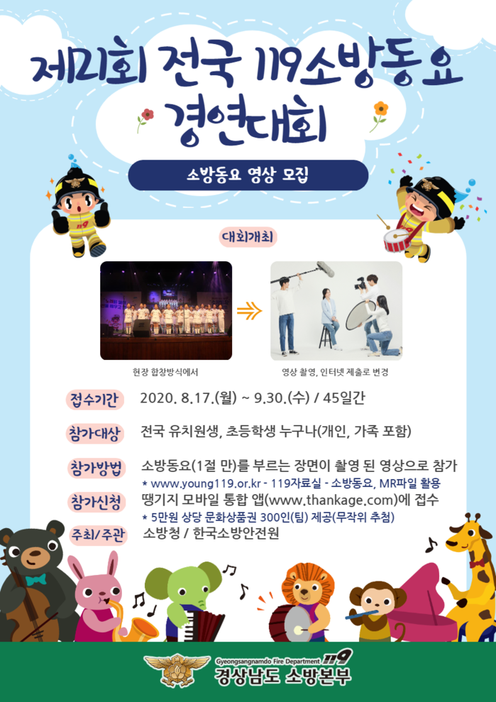 양산소방서(서장 김동권)는 코로나19로 인해 변경된 ‘제21회 전국 119소방동요 경연대회’ 참가·운영방식을 홍보한다고 밝혔다.