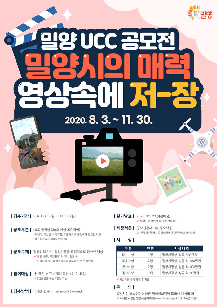 밀양시는 7월 27일부터 11월 30일까지 ‘2020년 밀양시 UCC 영상공모전’을 개최한다고 밝혔다.
