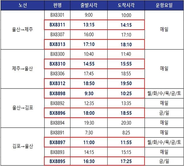 또한, 기존에 김포공항에서 오전 7시 10분에 출발해 오전 8시 5분 울산공항으로 도착하는 BX8891편의 운항시간을 오전 7시 30분 출발, 오전 8시 25분 도착으로 변경하여 승객들의 선택권이 넓어지고 이용도 한층 더 편리해질 전망이다.