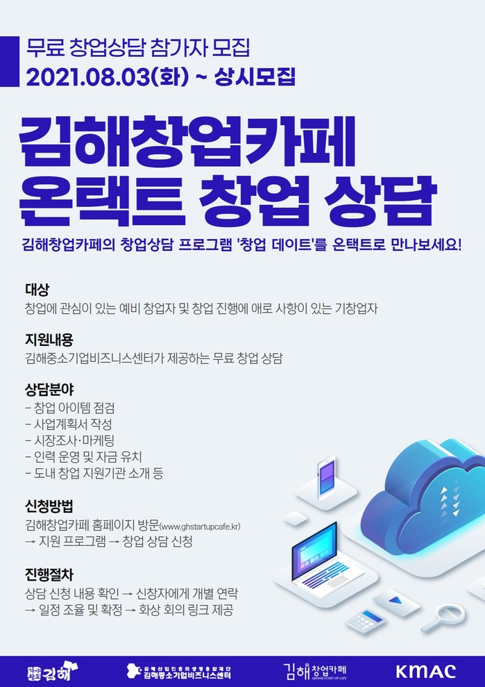 김해시·김해의생명산업진흥원(원장 윤정원, 이하 진흥원)에서 운영하고 있는 김해창업카페가 코로나19로 인해 휴관을 맞이함에 따라 비대면 창업지원 프로그램을 8월 3일부터 운영한다고 밝혔다.
