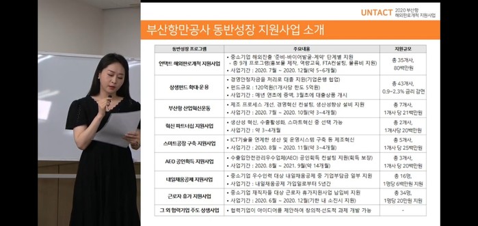 설명회는 부산항만공사와 부산상공회의소가 ▲사업취지 및 목표, ▲9개 프로그램별 사업진행 절차, ▲사업비 정산방법 등을 우선 설명하고, 뒤이어 참여기업들의 질의에 실시간으로 답하는 방식으로 개최됐다.