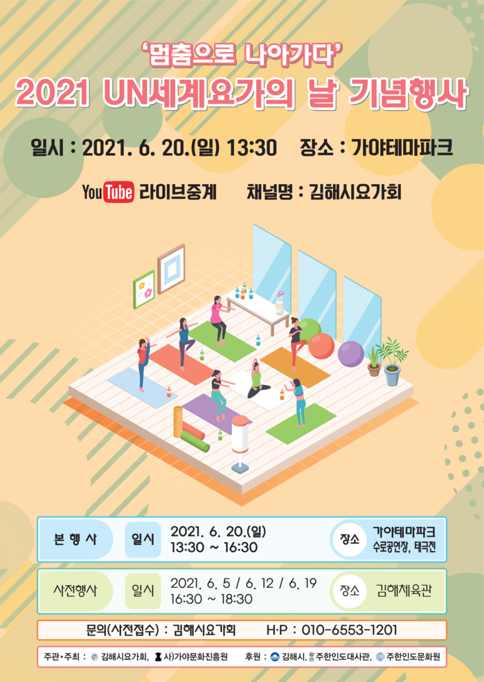 또 소규모 행사인 만큼 비대면 참여를 위해 페이스북, 유튜브 등에서 전체 행사를 생중계한다. 단체별 송출 SNS와 채널명은 ▲김해시요가회 유튜브 ▲가야문화진흥원 페이스북·인스타그램(가야의혼전문예술단체) ▲인도문화원 페이스북 이다.