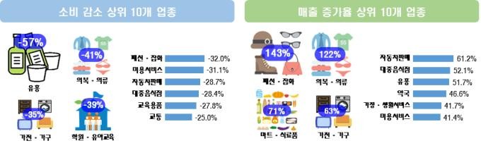 코로나19 인한 경기침체 현황을 분석한 결과, 소비감소가 가장 큰 업종은 유흥(-57%), 의복·의류(-41%), 학원·유아교육(-39%), 가전·가구(-35%), 패션·잡화(-32%) 순으로 나타났다.