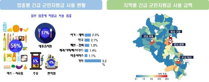 5월 말까지 사용된 긴급 군민지원금 197억원의 사용현황을 살펴본 결과, 마트·식료품(56%), 대중음식점(17%), 주유(5%), 편의점(4%), 여가·레저(3%)에 많이 사용하였으며, 특히, 대형마트에서 생필품, 식료품 등의 구매에 많이 사용되어, 일부 업종에 편중된 경향을 보였다.