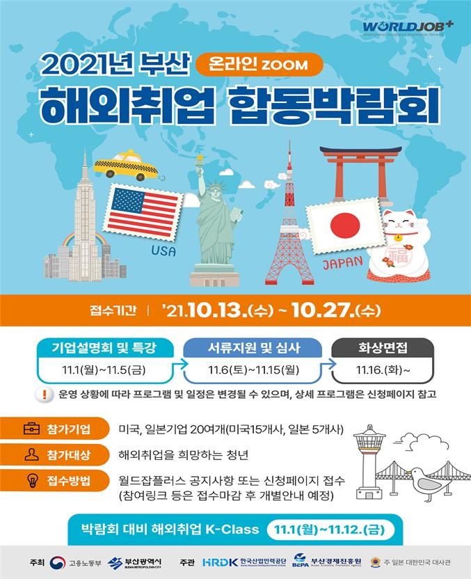 부산시(시장 박형준)는 부산 청년들의 글로벌 진출을 돕고자 ‘2021 부산 해외취업 합동박람회’를 개최한다고 밝혔다.