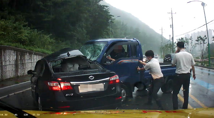 지난 27일 16시 37분 경 양산소방서 예방안전과 직원 2명은 관내 의료시설 소방시설 점검을 마치고 출장 복귀 중 동원과학기술대학교를 지난 1km 지점에서 승용차량(SM5)과 1톤 트럭(포터) 차량사고 현장을 목격했다.