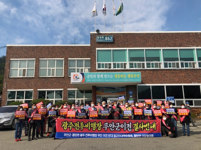 [무안=황승순 기자]광주 전투비행장 무안이전 반대 범군민대책위원회(위원장 박문재, 이하 범대위)와 몽탄면 이전반대 대책위원회 및 이장협의회는 지난 26일 몽탄면사무소 앞에서 합동으로 광주 군공항 무안군 이전 반대 결의대회를 가졌다.