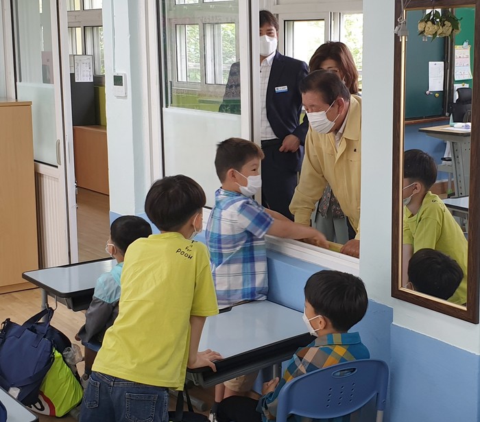 조 군수는 첫 등교한 아이들을 응원하고 교실·급식소의 학교 내 생활속 거리두기 조치상황과 손소독제, 마스크걸이 등 방역용품 비치 현황을 점검했다.