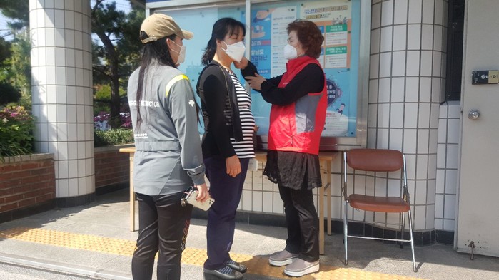 주민자치위원회, 통장단, 새마을부녀회, 여성자원봉사대 등 4개 단체가 주축을 이루고 있으며 매일 4명, 한 사람이 두 시간씩 조를 편성하여 발열체크 및 지원금 신청 안내를 하고 있다.