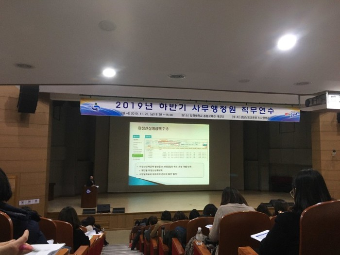 이번 연수는 사무행정원 행정업무역량 강화와 전문성 제고를 위해 학교회계 수입 실무, 학교회계 지출 실무, 미래세대 청렴 따라잡기 주제로 진행됐다.